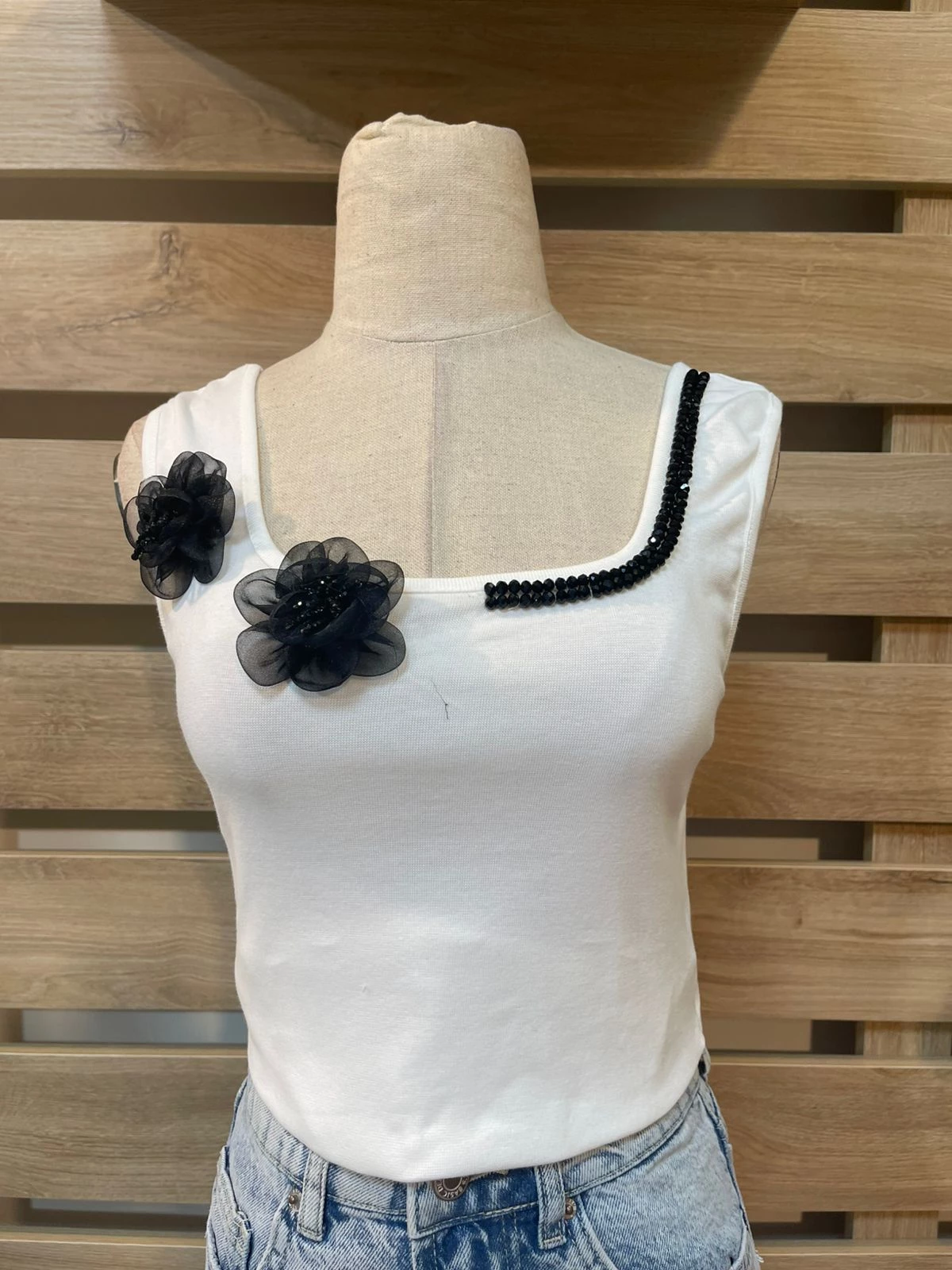 Black Flower Detailed White Top