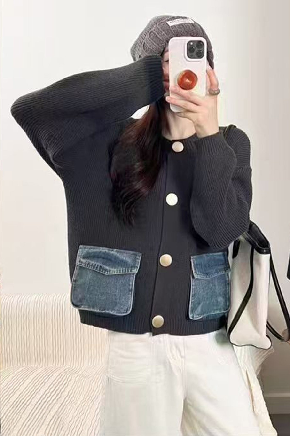 Round Neck Buttoned Anthracite Cardigan