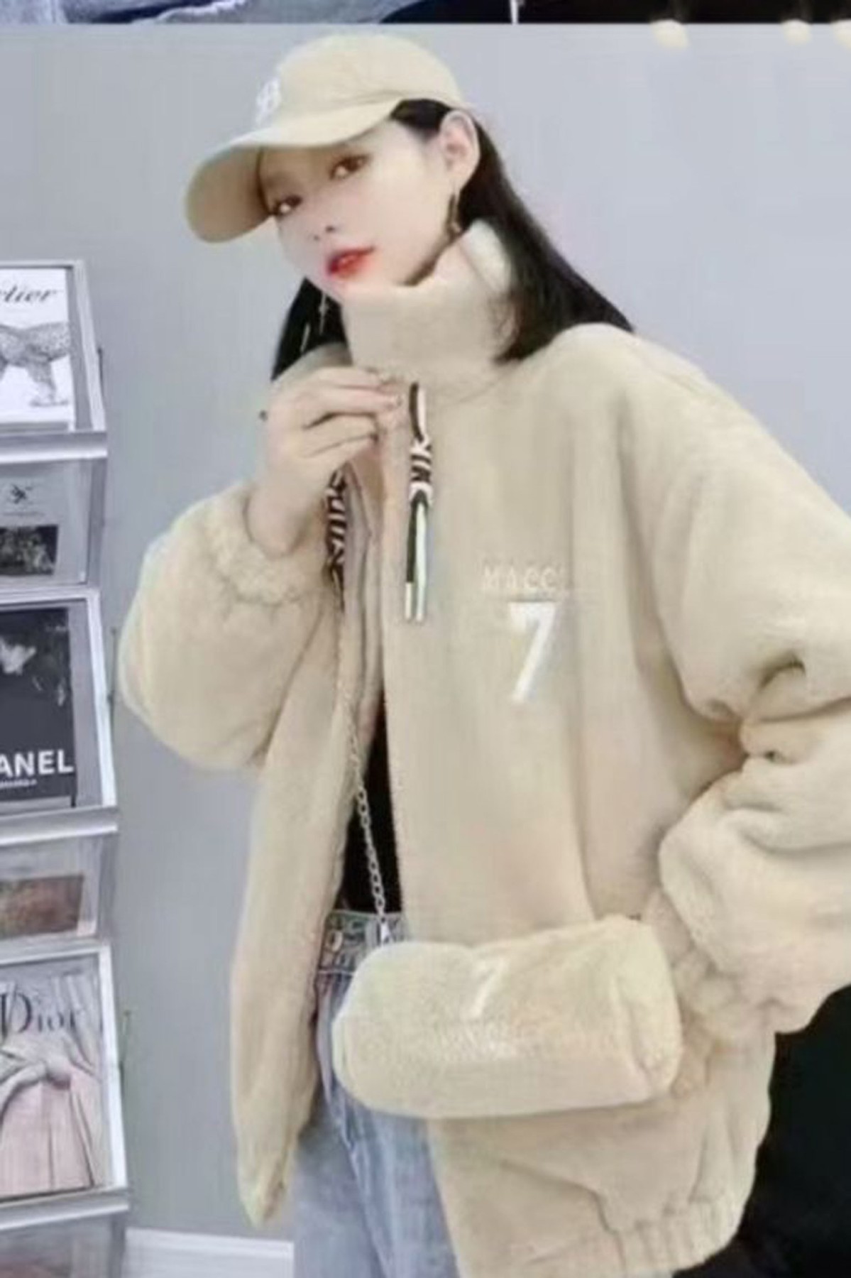 7 Detailed With Bag Beige Teddy Jacket