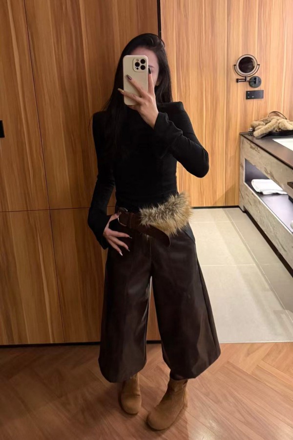 Fur Belted Faux Leather Bermuda Brown Shorts