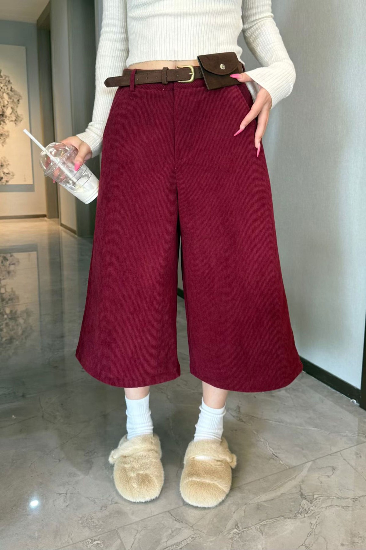Brown Belted Velvet Bermuda Bordeaux Shorts