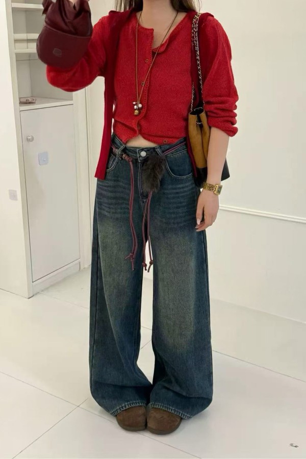 Bordeaux Belted Dark Blue Fleece Jeans