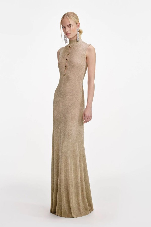 Gold Buttoned Glittery Beige Dress