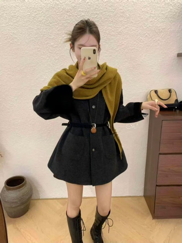 Buttoned With Scarf Mini Anthracite Coat