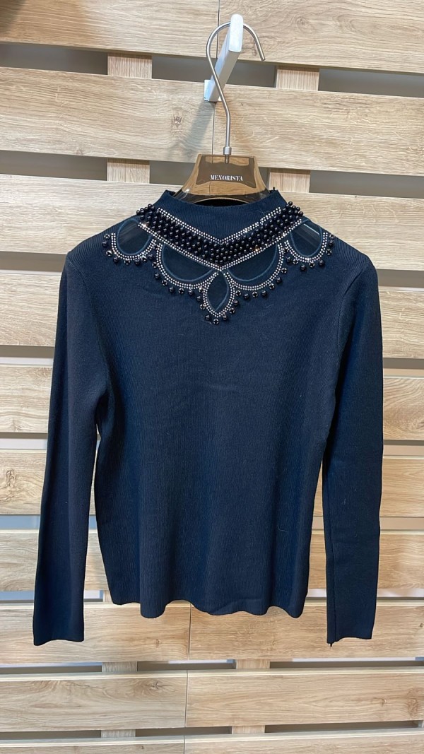Silver Neckline Detailed Black Top
