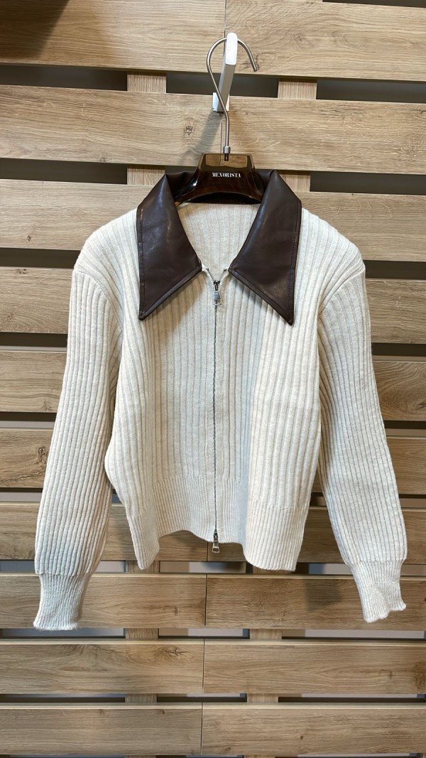 Leather Collar Beige Cardigan