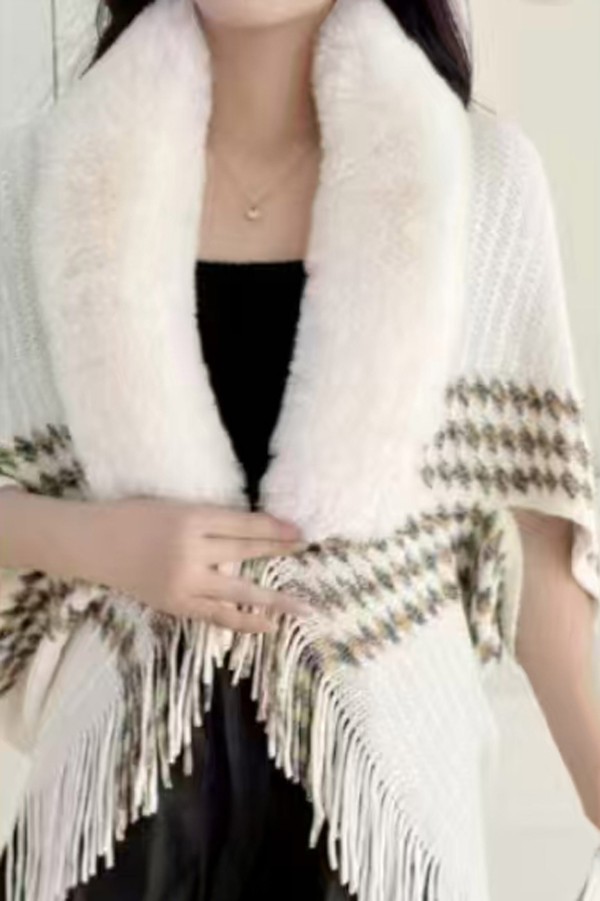 Sleeve Detailed Fur Neckline Ecru Poncho With Fringes