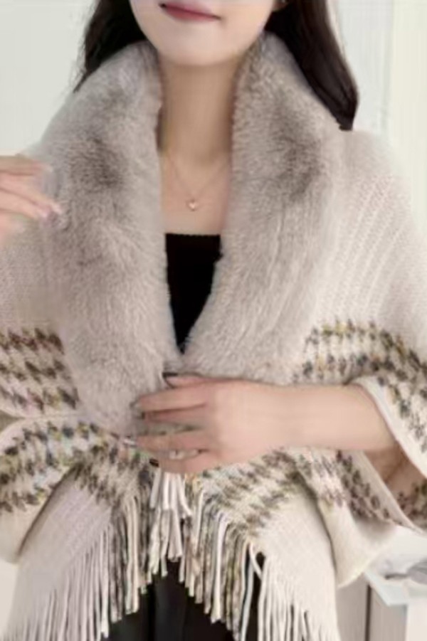 Sleeve Detailed Fur Neckline Beige Poncho With Fringes