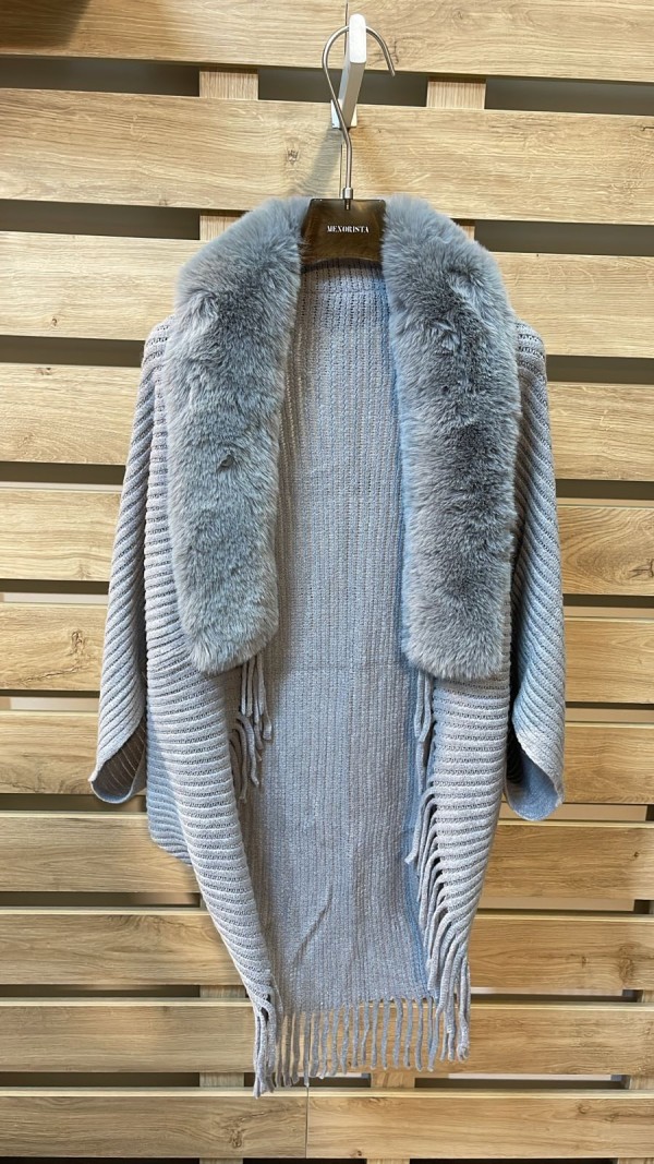 Fur Neckline Wool Grey Poncho With Fringes