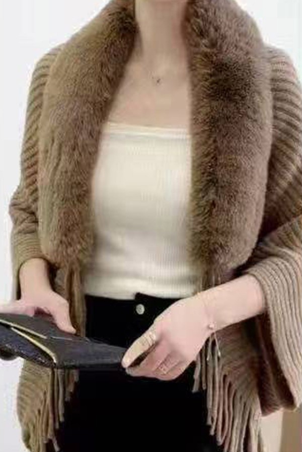 Fur Neckline Wool Mocha Poncho With Fringes