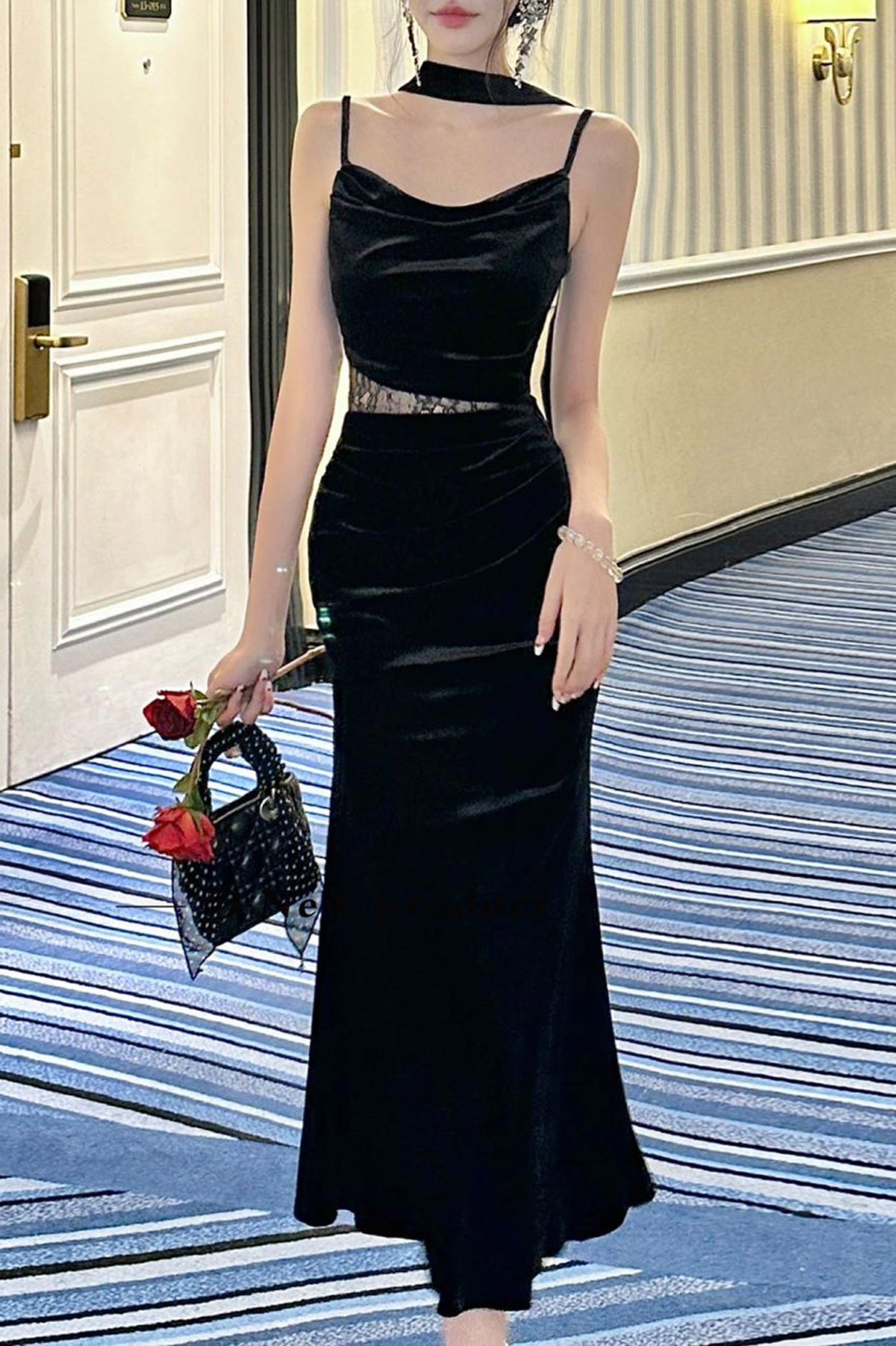 Draped Neckline Mesh Waist Black Dress
