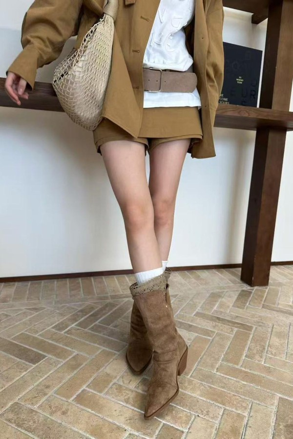 Beige Suede Mid-Calf Western Boots