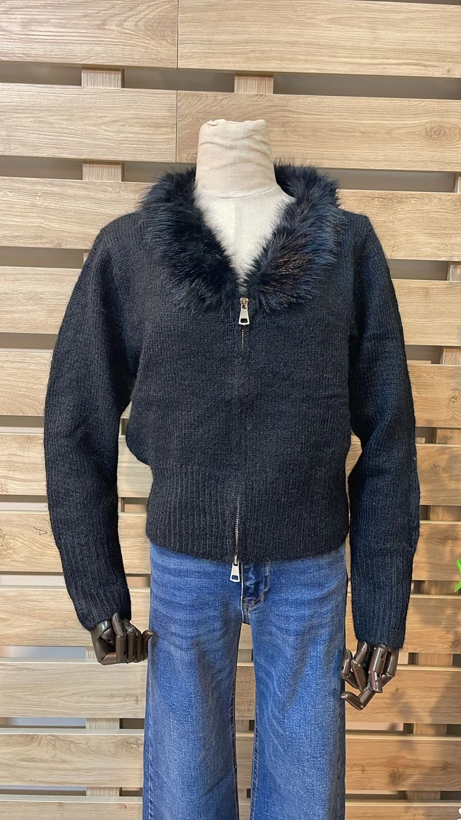 Fur Collar Zipped Black Cardigan
