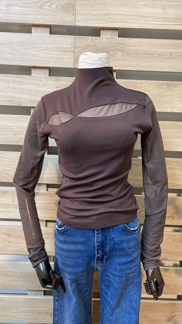 High Neck With Mesh Brown Top