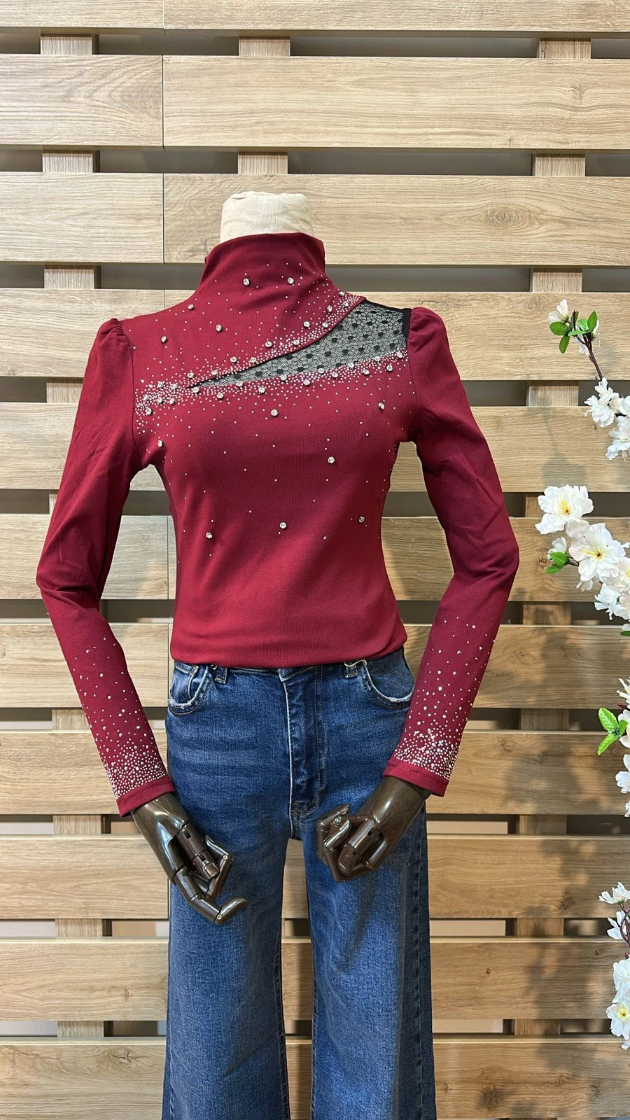 Pearl & Rhinestones Detailed Bordeaux Top