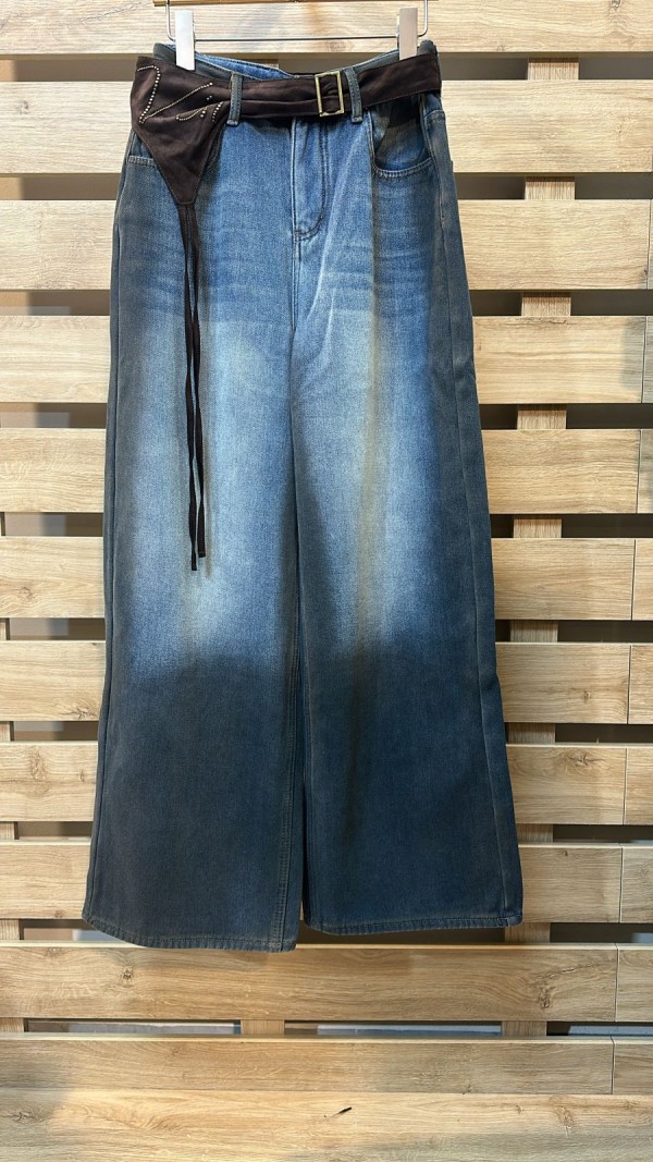 Brown Waist Belted Ombre Fleece Blue Jeans