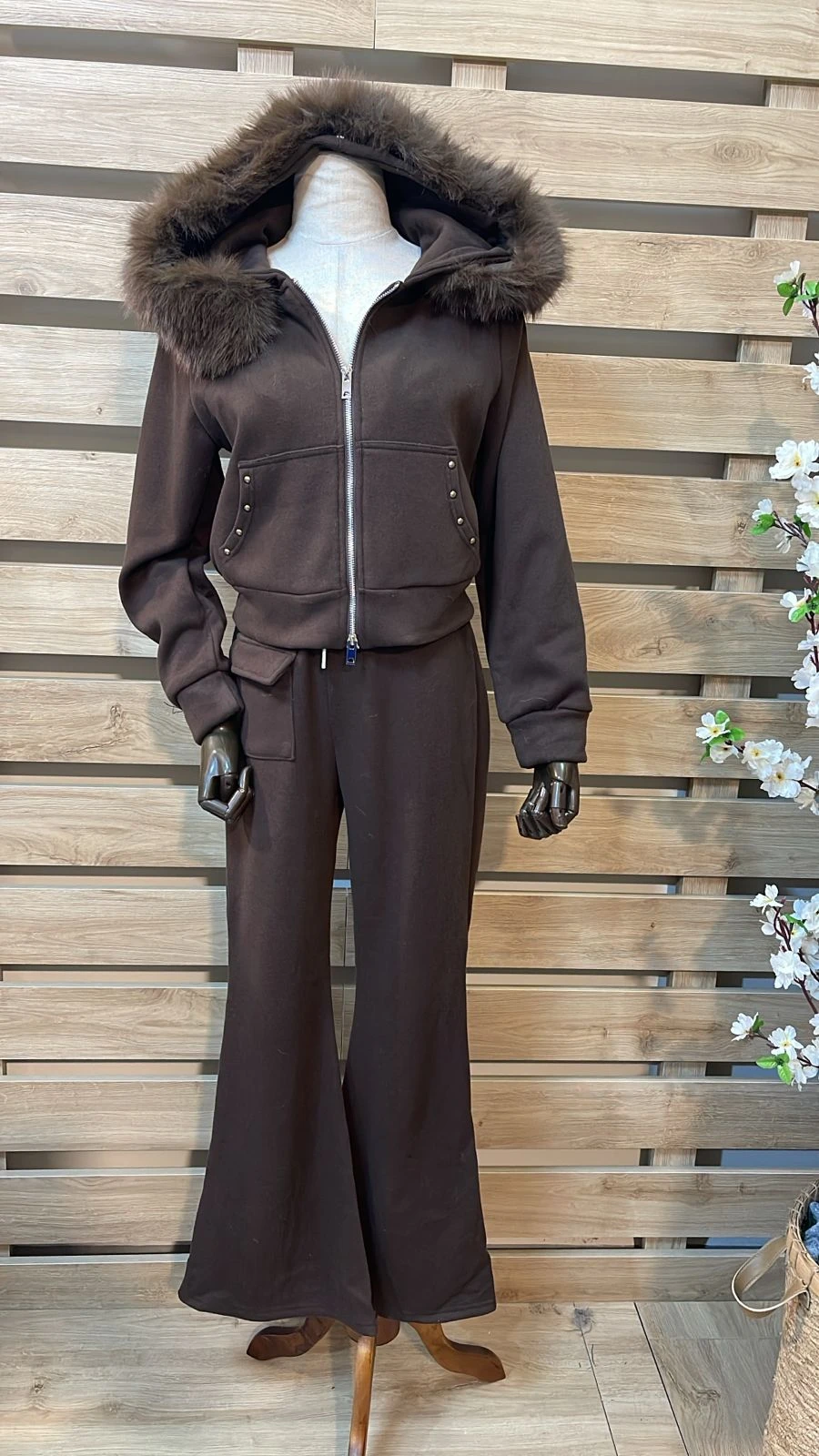 Stones Pocket Detailed Fleece Brown Tracksuit