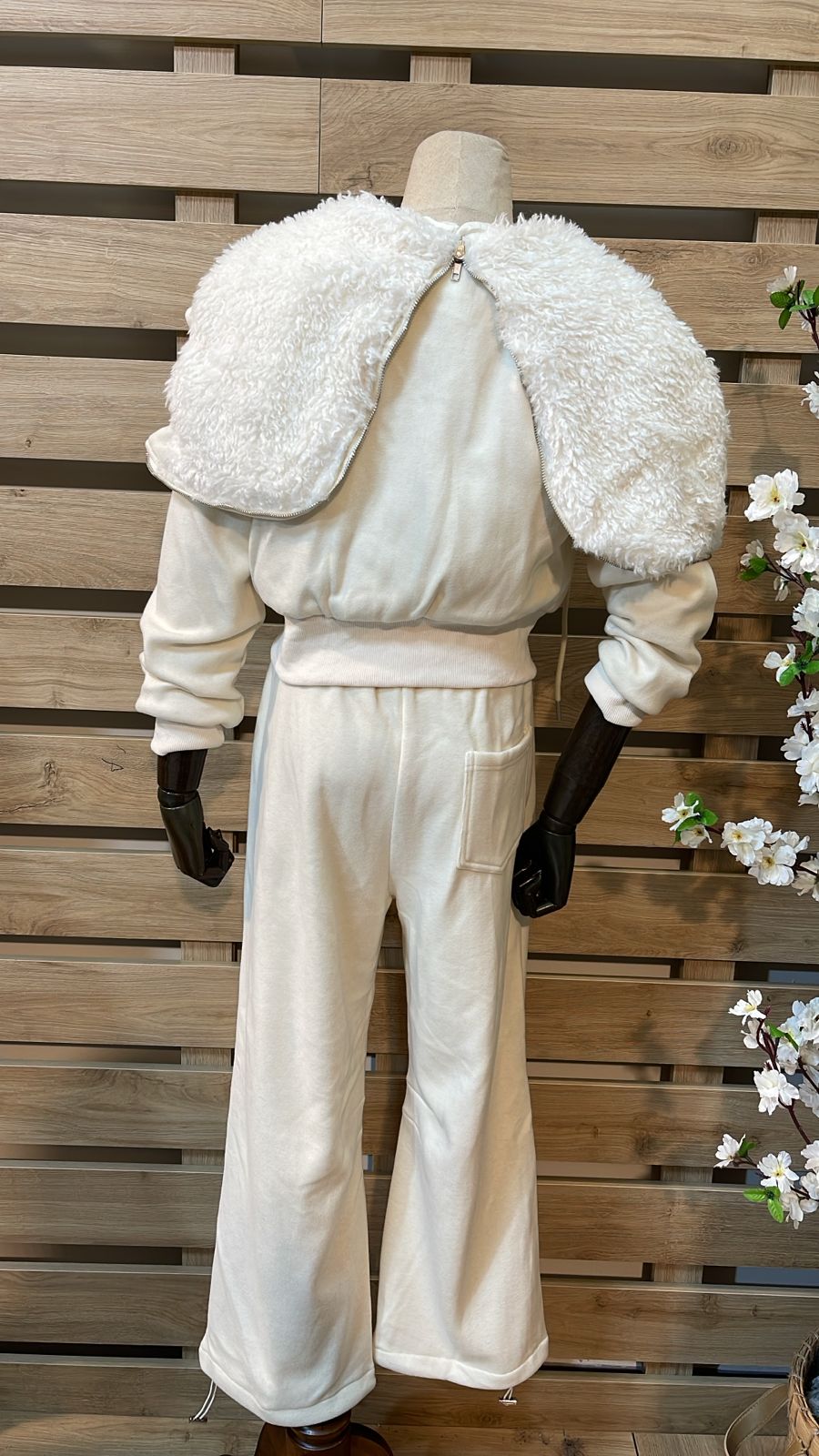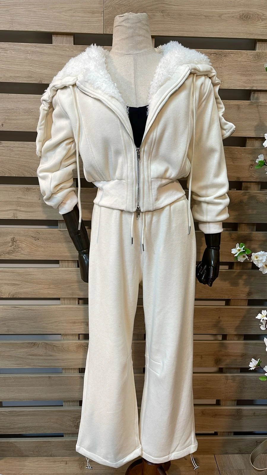 Curly Fur Zipped Hooded Ecru Tracksuit