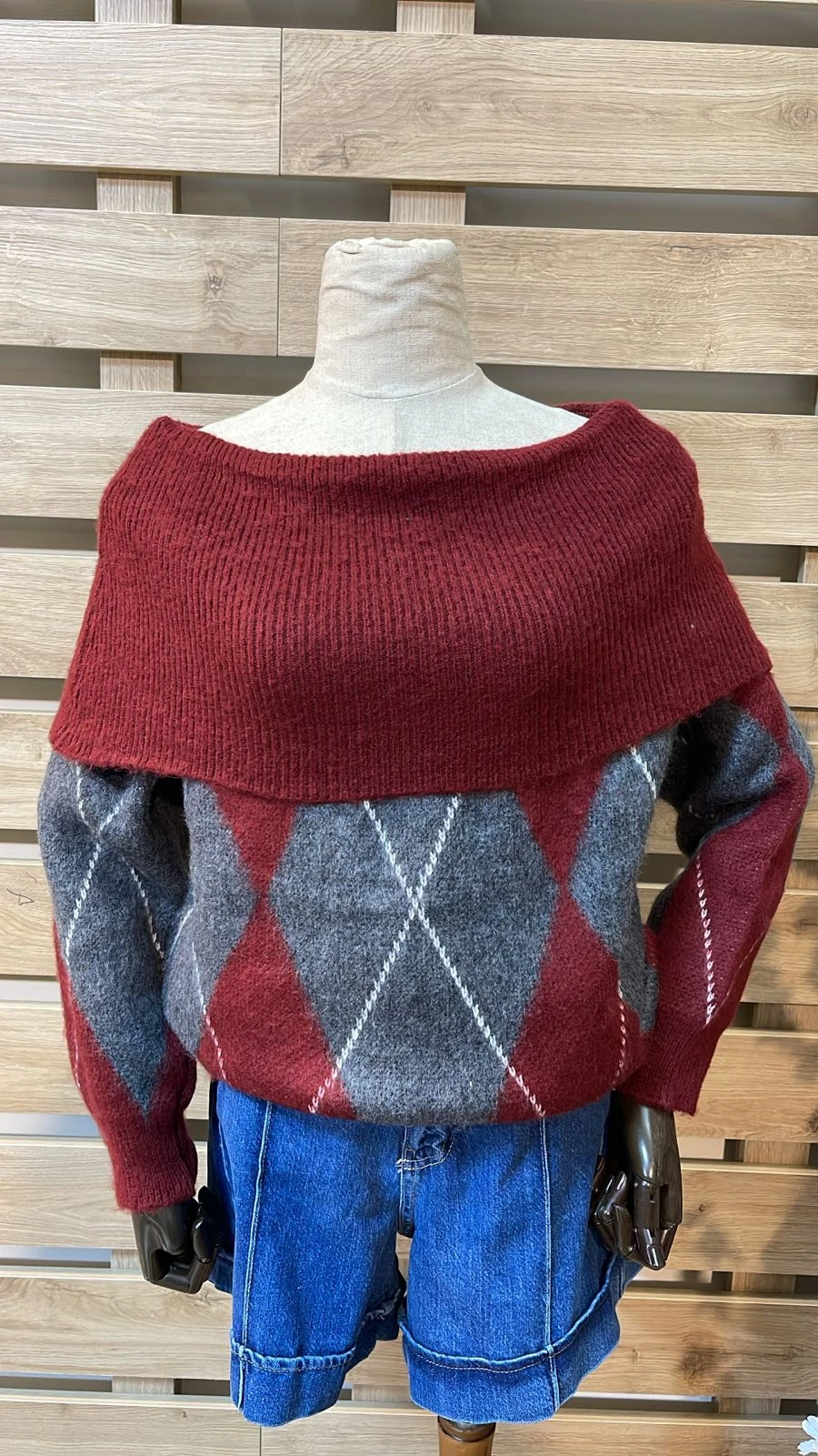Off-shoulder Rhombus Grey & Bordeaux Knitwear