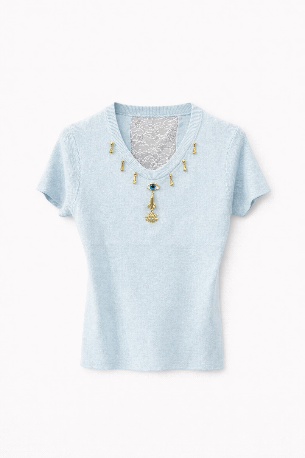 Gold Neck Line Buttons Short Sleeves Blue Top