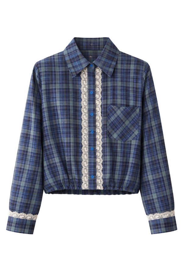 Mesh Deailed Squared Blue Shirt