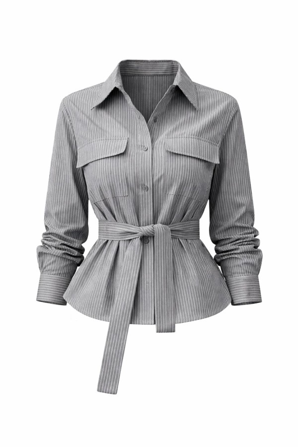 Waist Belted Striped Grey Shirt
