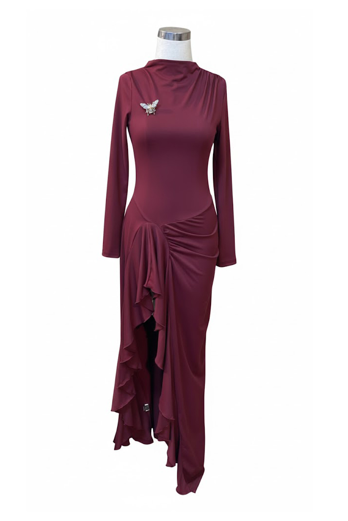 Ruffle Detail Draped Maxi Bordeaux Dress