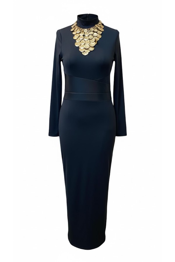 Faux Leather Waist Maxi Black Dress
