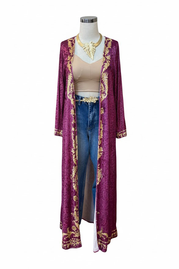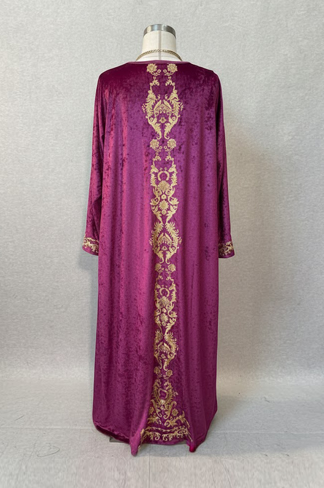 Gold Detailed Open Velvet Fuschia Abaya