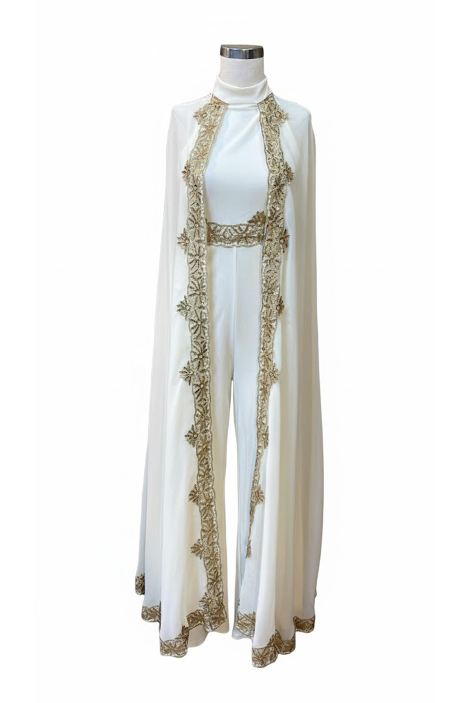 Two Pieces Gold Detailed White Abaya