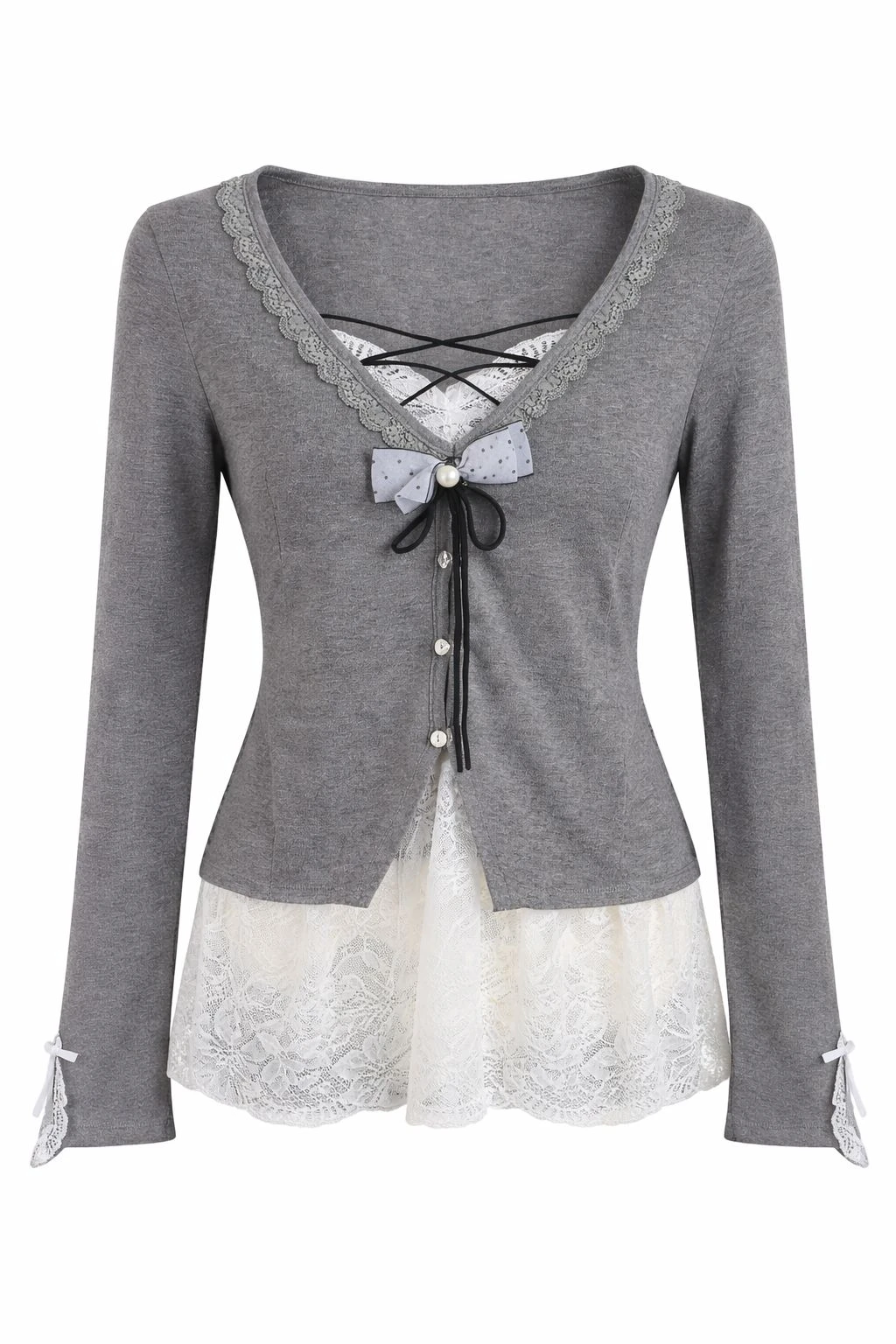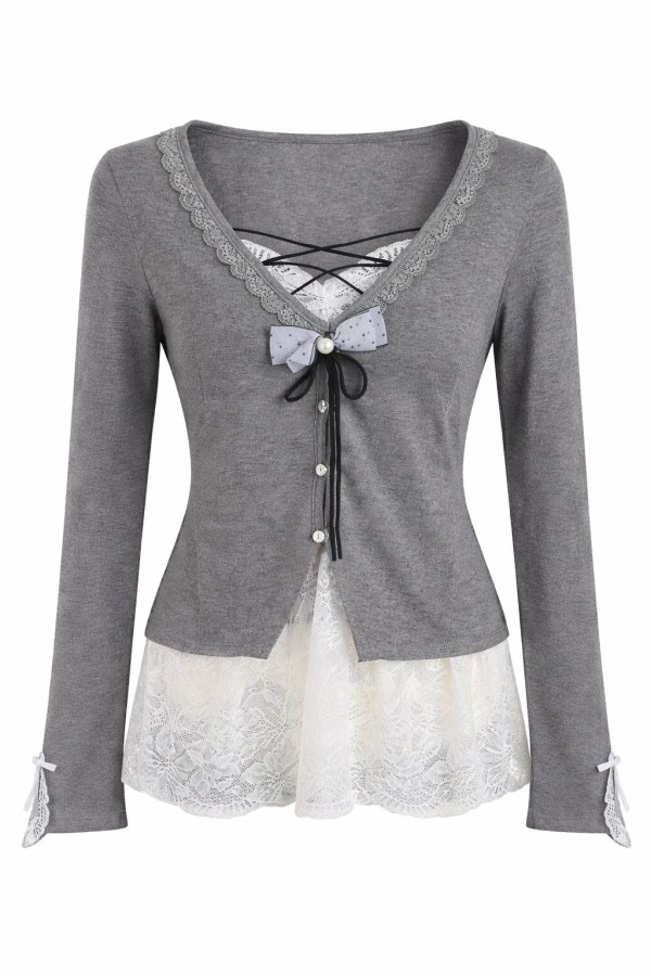 Bow With Mesh Detailed Grey Top