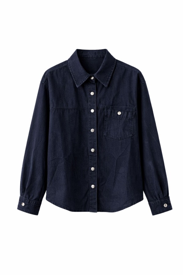 White Pocket Detailed Dark Blue Denim Shirt