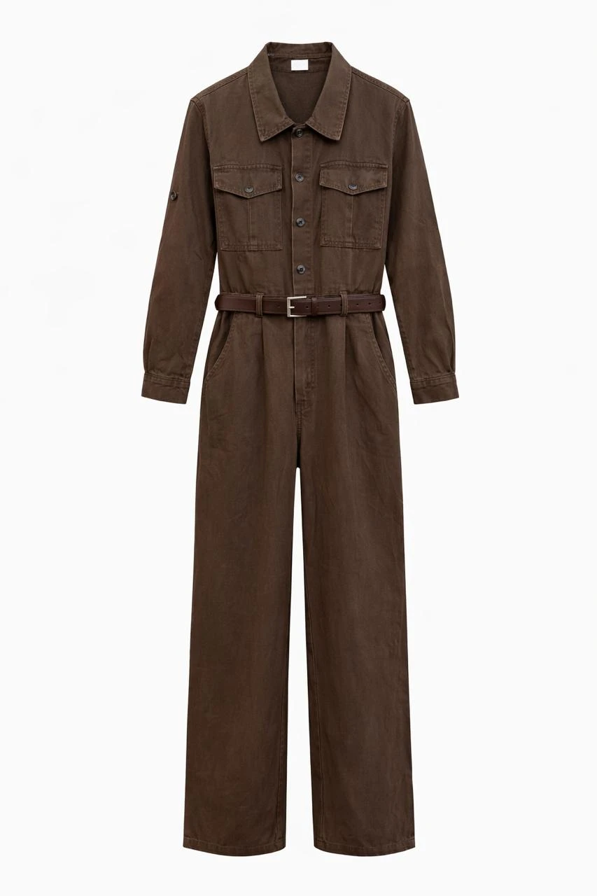 Belted Long Sleeves Brown Jumpsuit