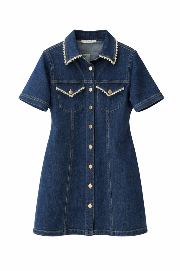 Pearl Detailed Dark Blue Denim Dress