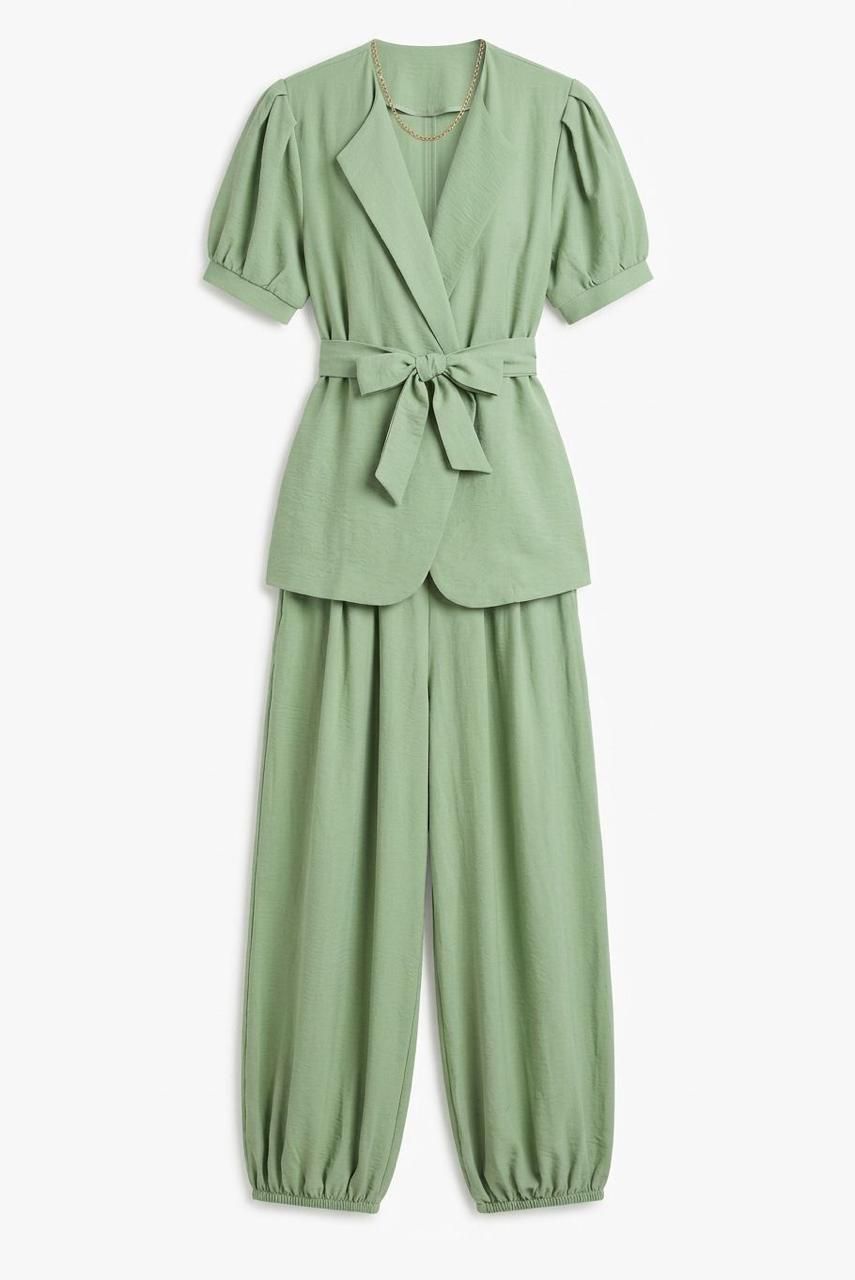 Short Sleeves Belted Pistachio Set